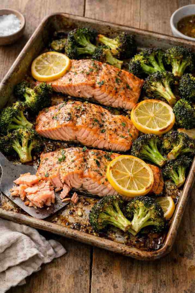 - Arrange salmon and veggies