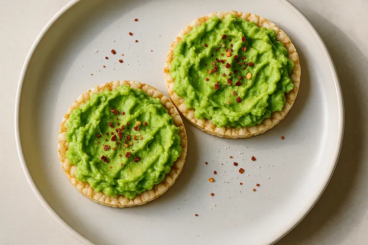 Ingredients: Brown rice cakes, ripe avocado, pinch of sea salt, chili flakes (optional).