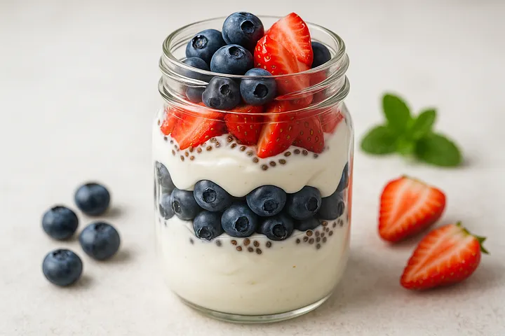 Ingredients: Greek yogurt (unsweetened), blueberries, strawberries, chia seeds.