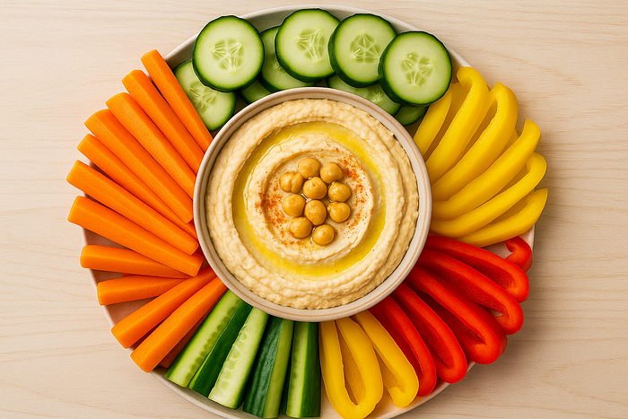Ingredients: Hummus (store-bought or homemade), mixed raw veggies.