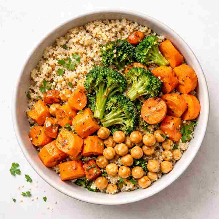 I lean hard on things that cook quickly and taste good with almost anything—bell peppers, zucchini, spinach, broccoli, onions, sweet potatoes, and cherry tomatoes. Frozen veggies count too. I always have a bag of frozen broccoli or spinach in my freezer.