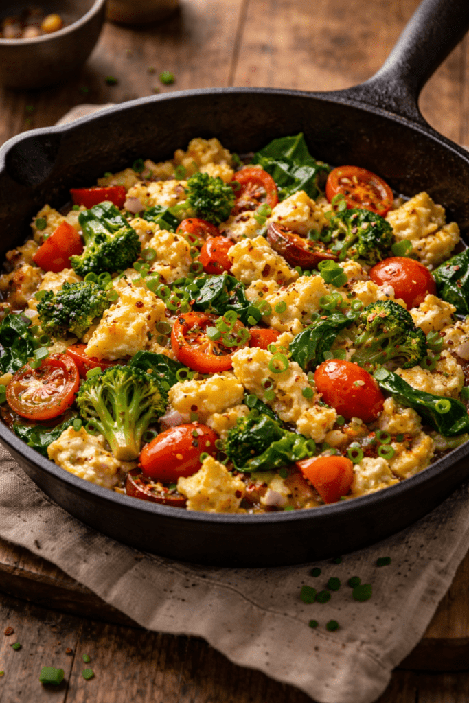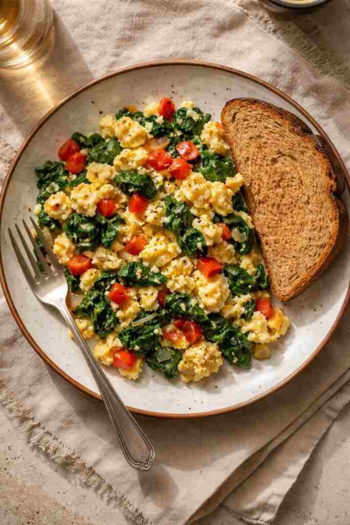 I make this on mornings when I want something warm and filling. The eggs and veggies keep me full, and the toast makes it feel like a real breakfast. It’s simple, comforting, and takes about 10 minutes. Leftovers reheat fine if I double it.