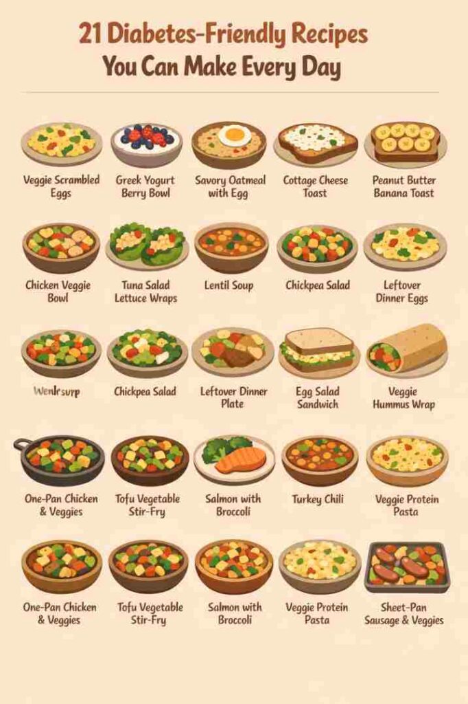 Over time, I figured out which meals actually worked better for my blood sugar without turning my kitchen into a rule-filled zone. These are the diabetes friendly recipes I actually make during the week — not perfect, not fancy, just realistic. The kind of food you cook when you’re tired, hungry, and want something that feels satisfying and familiar.