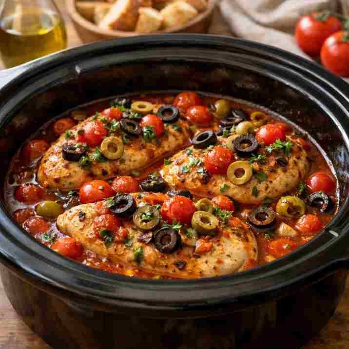 I make this when I want bold flavor without a lot of prep. Olives and tomatoes do most of the work here, especially after several hours in the slow cooker.