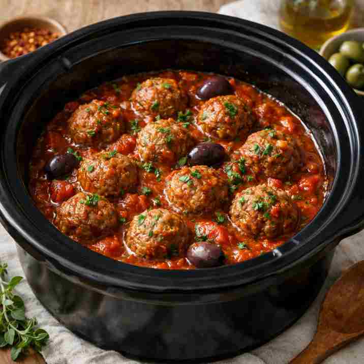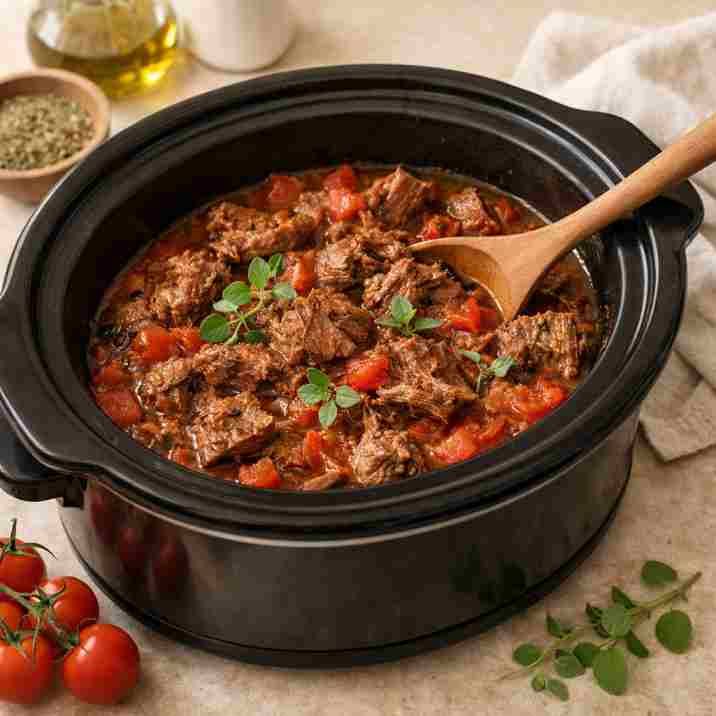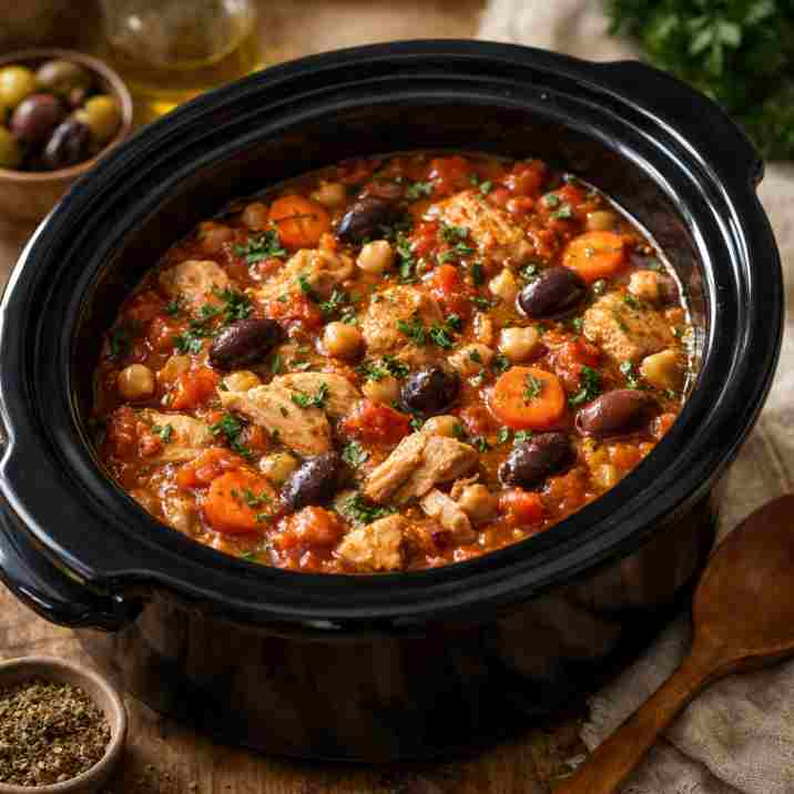 Mediterranean flavors work especially well in the crock pot. Tomatoes, garlic, olive oil, herbs — they all get better with time. Nothing fancy, nothing complicated, just food that smells good while it cooks and tastes even better later.