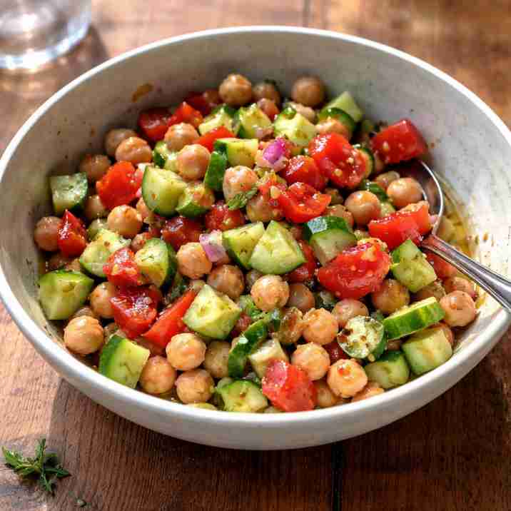 Chickpeas, cucumber, tomato, red onion, olive oil, lemon, herbs