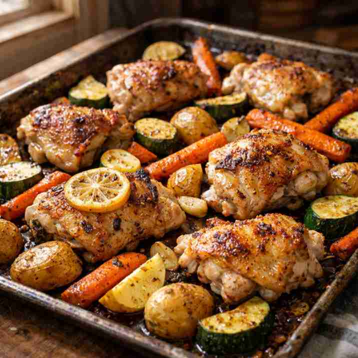 Chicken thighs or breasts, olive oil, garlic, lemon, mixed vegetables, salt, pepper