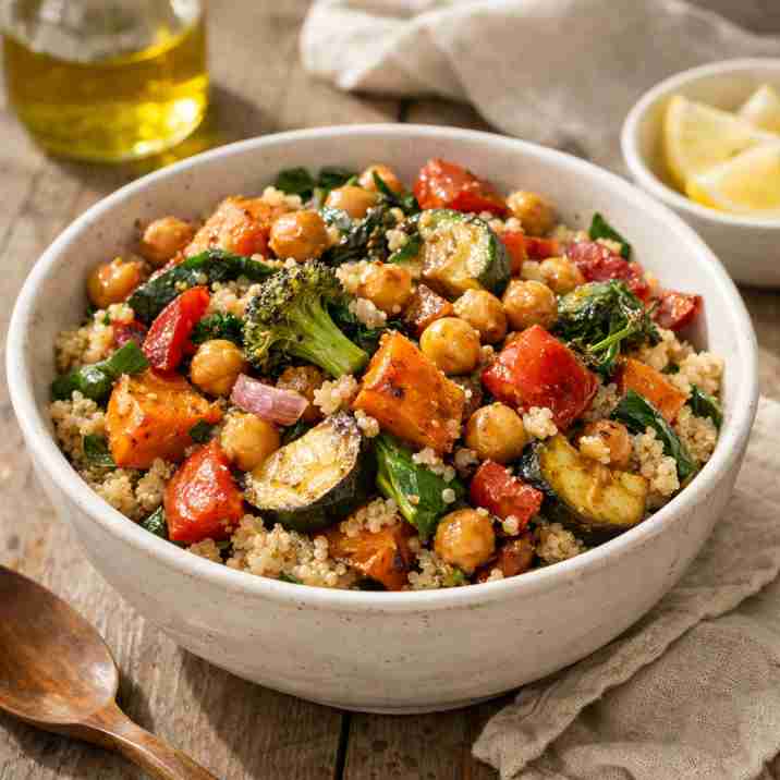 Quinoa, roasted veggies, chickpeas, olive oil, lemon