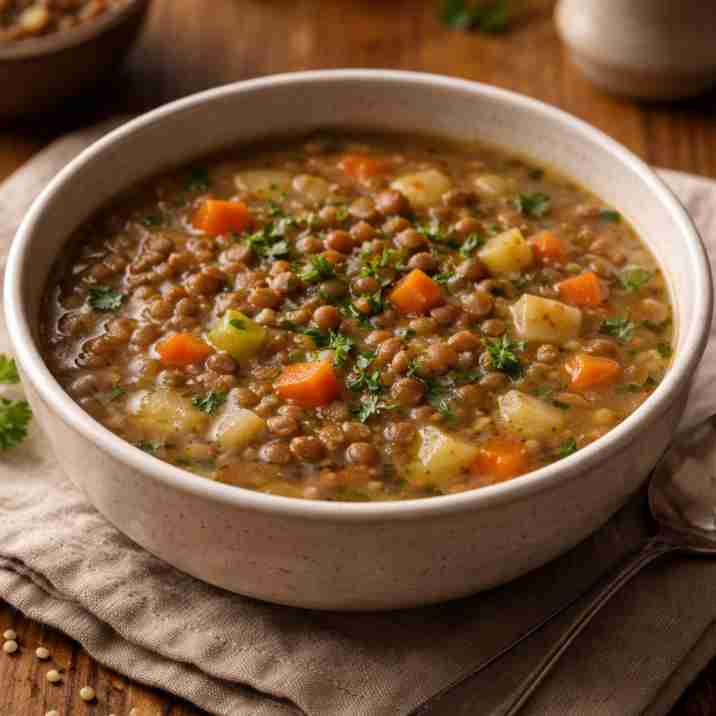 Lentils, onion, garlic, carrots, olive oil, herbs